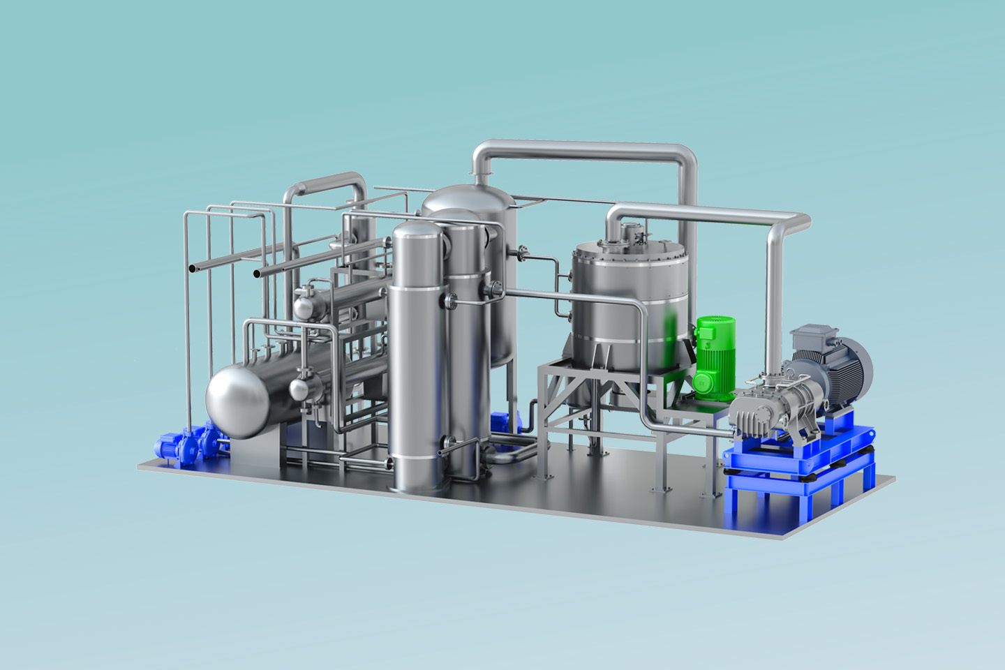MVR熱泵精餾系統(tǒng)以高效旋轉(zhuǎn)精餾床為基礎(chǔ),利用離心力場(chǎng)代替重力場(chǎng),強(qiáng)化相與相之間的相對(duì)速度和相互接觸,通過強(qiáng)化傳質(zhì)傳熱來提高分離效率縮小設(shè)備體積。 通過在系統(tǒng)中引入適用于小流量、大壓比的螺桿式蒸汽壓縮機(jī),即可實(shí)現(xiàn)MVR循環(huán)熱泵精餾。